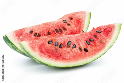 Fresh watermelon slice on a white background, showing its juicy interior and seeds