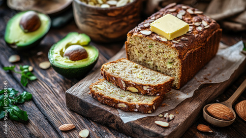 Freshly baked almond bread loaf sliced and topped with butter, served with avocado halves and almonds on rustic wooden table, creating warm and inviting atmosphere