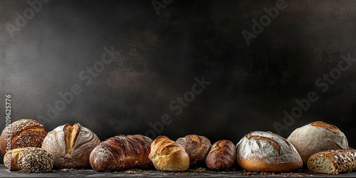 Freshly baked artisanal breads including white and rye loaves with assorted buns arranged on a rustic dark wooden surface against a dark backdrop