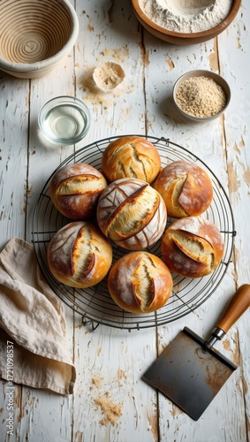 Freshly baked artisanal sourdough bread rolls arranged on a cooling rack with baking ingredients and tools scattered around on a rustic wooden table