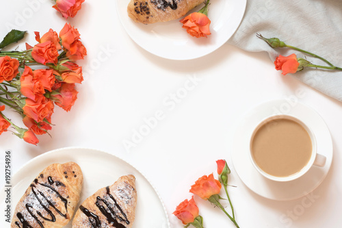 Freshly baked chocolate croissants and cup of coffee on white table. Top view. Female breakfast. Copy space.