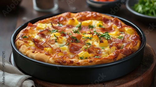 Freshly Baked Golden Brown Homemade Pizza Topped with Cheddar Cheese Green Herbs and Colorful Peppers in Rustic Dining Setting
