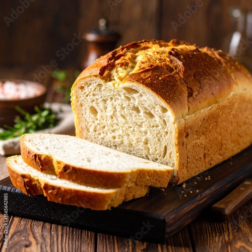 Freshly baked homemade white bread loaf with a golden crust, sliced on a rustic dark wooden board.