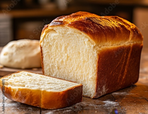 Freshly baked loaf of bread, sliced open, showing golden-brown crust and light, airy interior