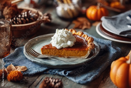 freshly baked pumpkin pie with whipped cream on a rustic autumn themed table