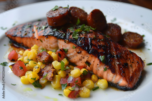 Freshly Blackened Salmon on a Plate with Cajun Corn Salsa and Chorizo Sausage Accessing Burst of Flavours