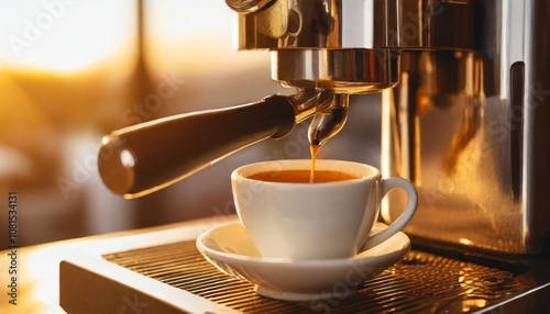 Freshly Brewed Espresso Shot Streaming Into a Ceramic Cup From a Professional Coffee Machine, Capturing the Texture and Aroma in an Elegant Coffee Shop Setting