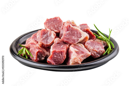 Freshly chopped lamb meat with vibrant herbs prepared for cooking in a rustic style