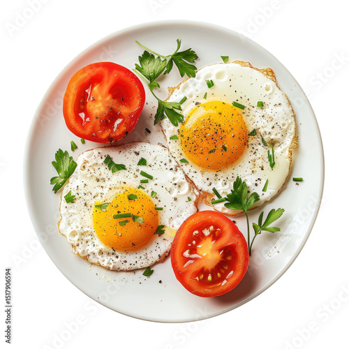 Freshly cooked sunny-side up eggs with ripe tomatoes on a white plate garnished with parsley for a healthy breakfast option