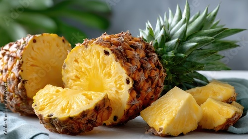 Freshly cut pineapple displayed on a light surface alongside whole pineapple with green leaves in a cozy kitchen setting