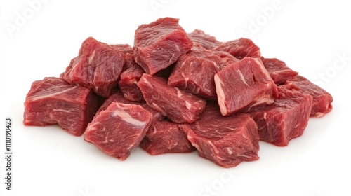 Freshly cut raw beef cubes ready for cooking and culinary preparation on a clean white background