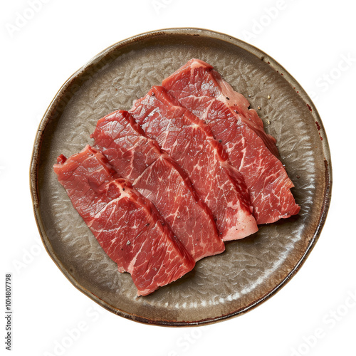 Freshly Cut Raw Beef Slices Arranged on a Round Plate.