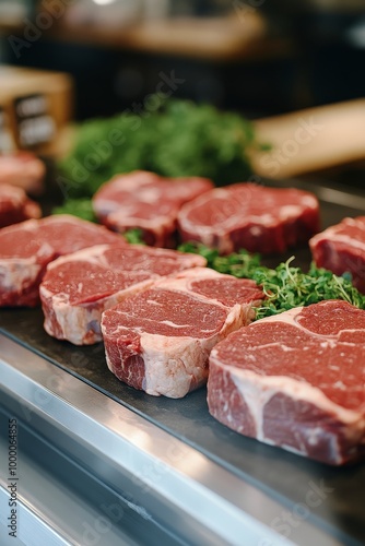 Freshly cut ribeye steaks displayed on a butcher's counter in a market during the day