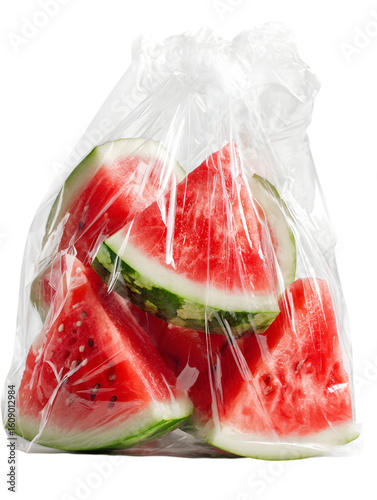 Freshly cut watermelon slices in a clear plastic bag, ready for sale in a vibrant market setting