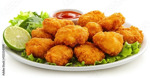 Freshly Fried Chicken Nuggets Served on a White Plate with Crisp Lettuce, Lime Wedges, and Dipping Sauce for Delicious Snack Ideas