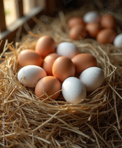 Freshly gathered eggs in a rustic straw nest on a sunny morning