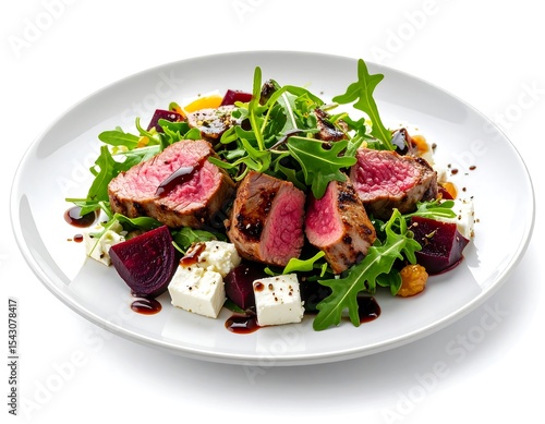 Freshly Grilled Lamb Chops with Beetroot and Cheese on a White Plate Decorated with Greens