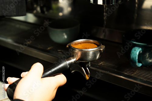 Freshly ground pressed coffee, ready to be served in a professional automatic coffee machine. A woman's hand holds a pre-filter with ground coffee, preparing it for brewing. Process of making espresso