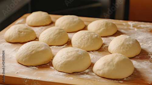 Freshly kneaded dough balls resting on a wooden surface, dusted with flour, ready for baking.
