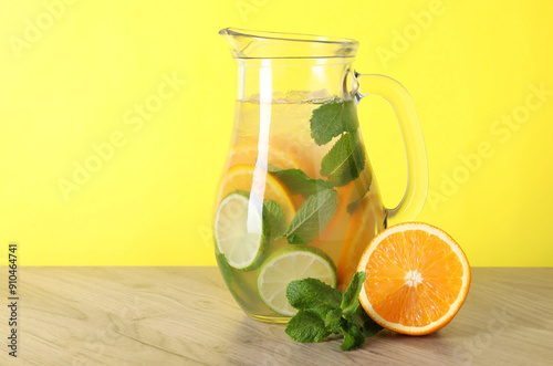 Freshly made lemonade with mint in jug on wooden table against yellow background