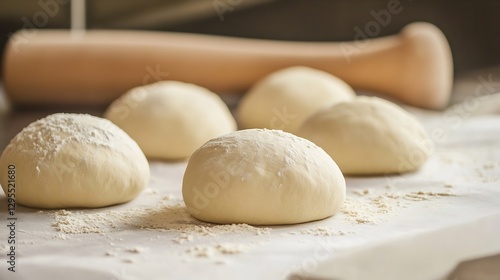 Freshly made pizza dough balls ready for baking on a rustic kitchen counter : Generative AI