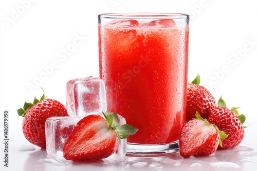 Freshly made strawberry juice in a glass with ice cubes.