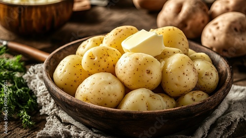 Freshly Peeled Potatoes with Butter in Rustic Wooden Bowl