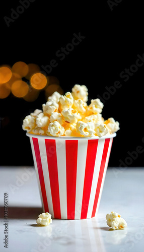 Freshly popped popcorn in a stylish paper cup against a dark background. Perfect for movie night themes, snacks, and casual dining visuals
