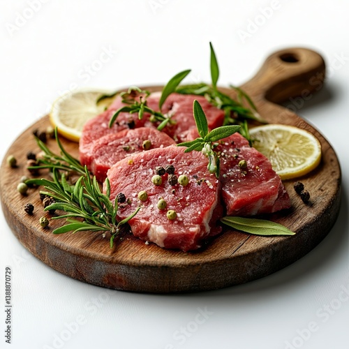 Freshly prepared meat cuts arranged on a wooden board with herbs and lemon slices