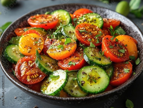 Freshly sliced colorful tomatoes and cucumbers in a bowl, garnished with herbs and spices