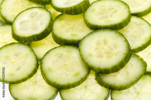 Freshly sliced cucumber isolated on white background