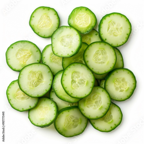 Freshly sliced cucumbers, arranged in a circle, isolated on white.