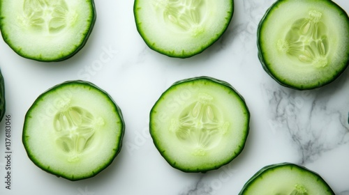 Freshly sliced cucumbers on a marble surface showcasing their vibrant color and texture