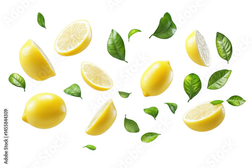 Freshly Sliced Lemon Segments Surrounded by Green Leaves on a Transparent Background