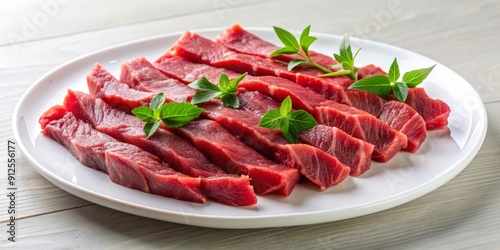Freshly sliced raw beef strips, arranged artfully on a pristine white plate, showcasing tender uncooked culinary ingredient, ready for culinary creation in a sleek kitchen setting.