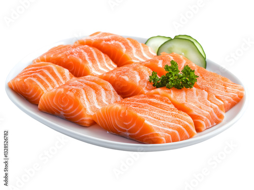 Freshly sliced salmon fillets arranged on a simple white plate on transparent background, cut out, PNG 3D Digital Art, clip art.