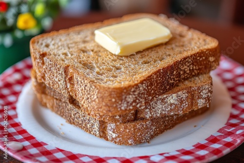 Freshly toasted brown bread with a pat of butter on a plate in a cozy cafe setting
