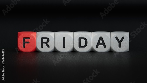 friday word concept. wooden cubes, notepad, pen and business charts.close up of wooden elements,Business Concept.3D rendering on black background.