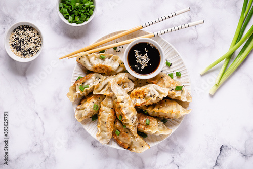 Fried dumplings gyoza with soy sauce, and chopsticks.