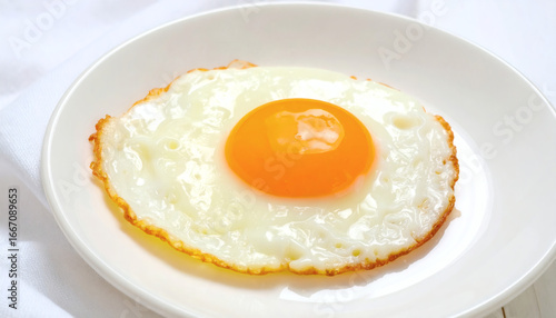 Fried Egg on White Dish Close-Up, High-Resolution Breakfast Food Photography, Realistic Egg Texture for Culinary and Food Styling Projects