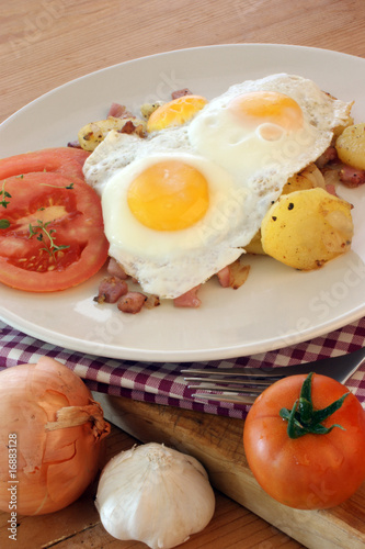 fried egg with organic potato and bacon