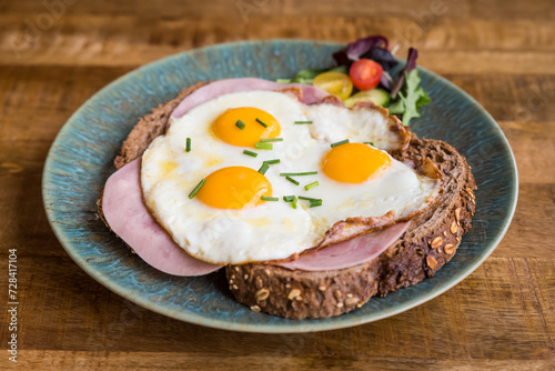 Fried eggs and ham on brown bread on a plate on a wooden table in café restaurant