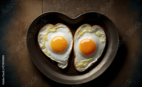 Fried eggs in a frying pan, heart shaped eggs sunny side up in a cast iron dish. Image created with generative ai.