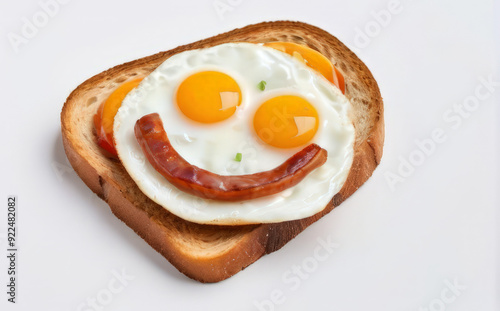 fried eggs in the form of a smile with a sausage on a toasted piece of bread