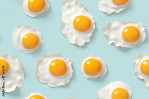 Fried eggs on blue pastel background seamless pattern, top view creative tile ornament, fried egg repeat texture for wrapping paper or textile print. 3d render cartoon illustration style.