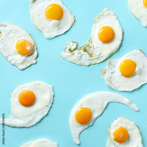 Fried eggs or scrambled eggs pattern on blue background. Creative food concept. Top view. Square crop