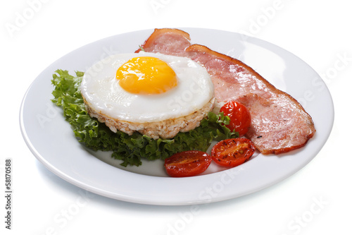 fried eggs with bacon, lettuce and tomato isolated on white