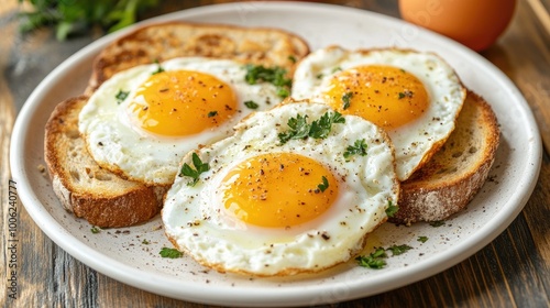 Fried eggs with herbs and toast on a white plate, served on a wooden table, set in a cozy, realistic kitchen atmosphere