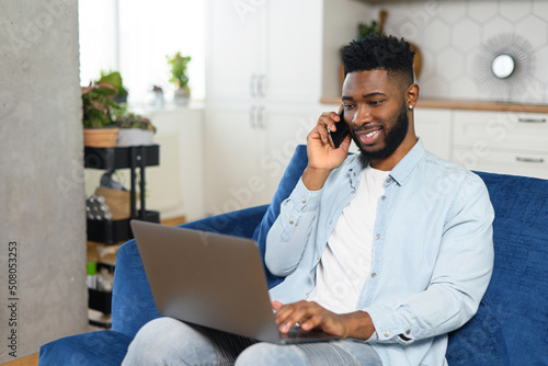 Friendly and positive young male employee talking on the smartphone sitting on the couch. Cheerful freelance man takes an order and making marks on the laptop