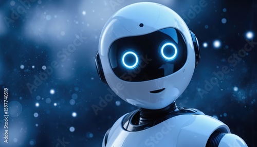 Friendly blue robot with glowing eyes, set against futuristic, abstract background. Intelligent machine represents advanced technology, AI innovation. Sleek, modern design suggests progress, future